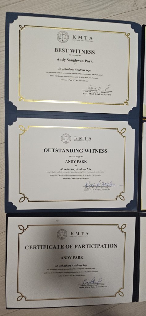 • Best Witness Award at the Korean Mock Trial Association, Aug 2024