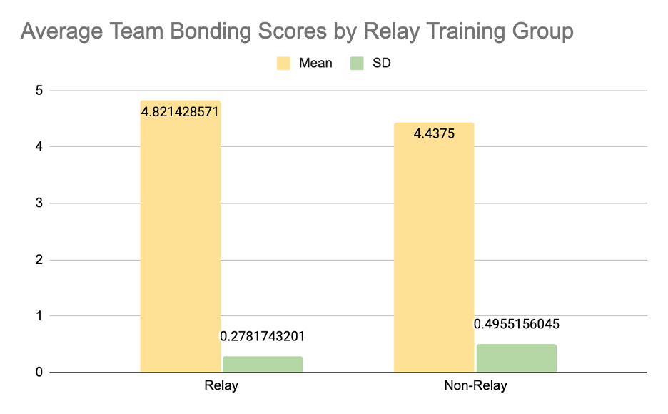 Figure 4 illustrates that bonding scores exhibited greater variability within the Non-Relay group, with certain participants recording scores below 4.0. The Relay group exhibited scores predominantly in the higher range (≥ 4.25), suggesting a higher level of perceived cohesion consistency. The smaller standard deviations observed in the Relay group support this difference in variability.