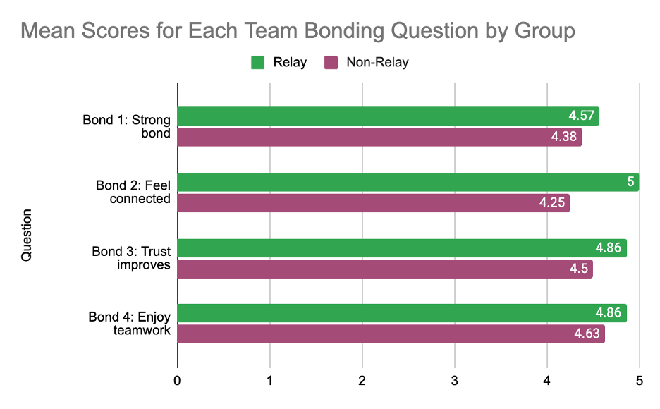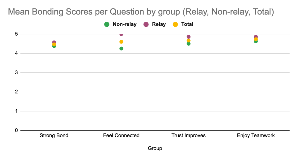 Figure 1 showed the average bonding scores for each group. The Relay group demonstrated a greater mean bonding score (M = 4.82, SD = 0.28) relative to the Non-Relay group (M = 4.44, SD = 0.50). Taken together, the findings imply that regular engagement in relay practice may contribute to heightened perceptions of team cohesion. To investigate the aspects of bonding that contributed to this discrepancy, each survey question was analyzed separately. Figure 2 depicts the mean score for each bonding item classified by group, while Figure 3 shows the same results alongside the overall average across both groups. The Relay group consistently achieved higher average scores on all four queries. The Relay group achieved a mean score of 5.00, while the Non-Relay group achieved a mean score of 4.25. The statement “Relay practices make me feel more connected to my team” showed the most significant difference. Supplementary items, including “I feel a strong bond with my teammates during practices” (Relay: 4.57, Non-Relay: 4.38) and “Working together in training improves our trust” (Relay: 4.86, Non-Relay: 4.50), exhibited minor yet persistent inconsistencies.