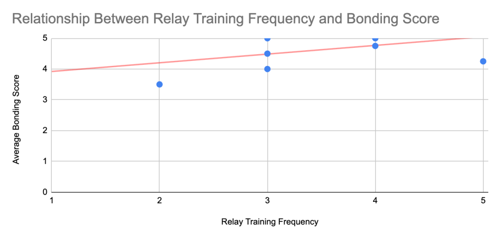There were four statements in the team bonding section that were meant to measure the physically and emotionally connected teammates felt to each other. A distinctive set of four survey questions was developed for this research to assess team bonding. These questions, which are detailed in Appendix A, were based on common thoughts regarding how to make teams work better together, instead of an existing validated scale. Participants evaluated their concurrence with statements such as “I feel a strong bond with my teammates during practices” and “Relay practices enhance my connection to my team,” utilizing a 5-point Likert scale (1 = strongly disagree, 5 = strongly agree).